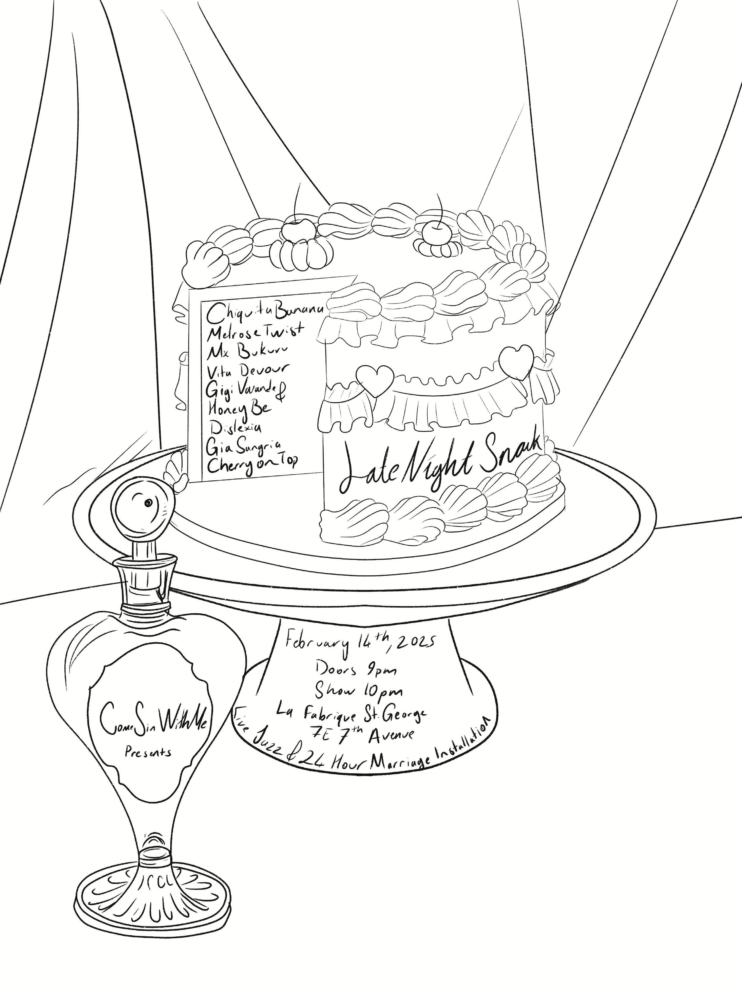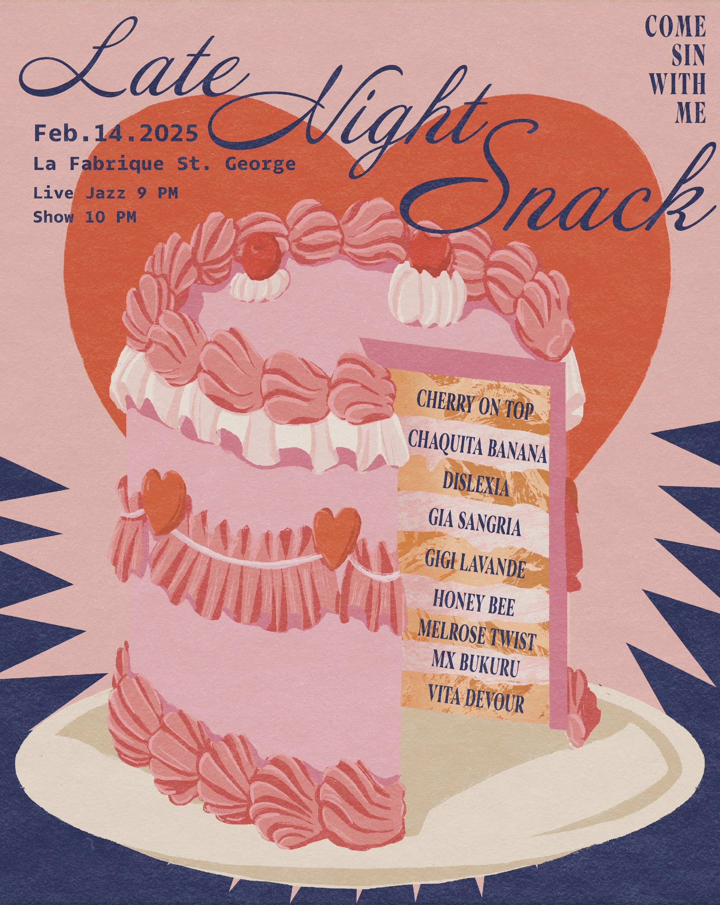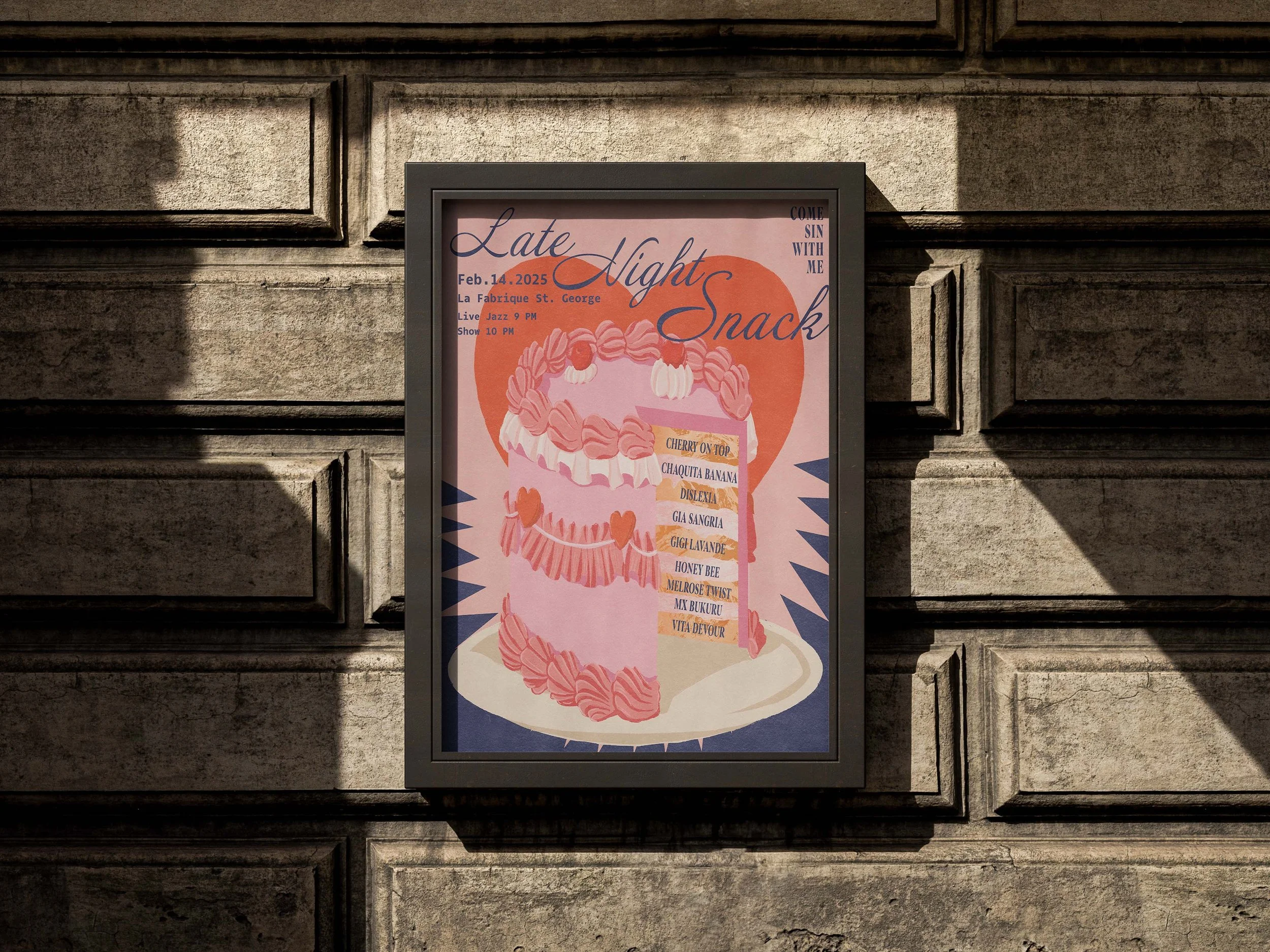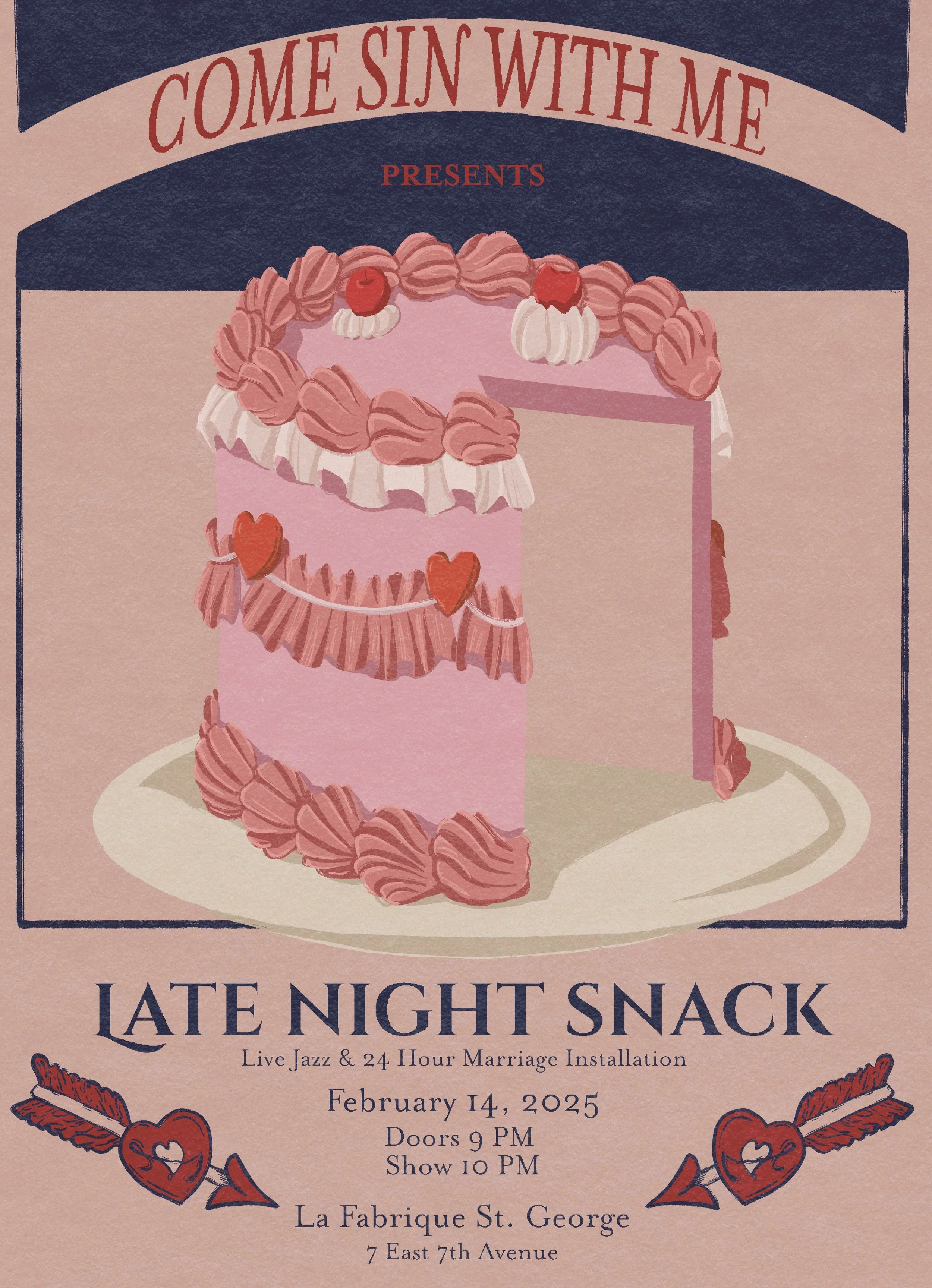Inspired by the vintage burlesque dancers and romantic valentines cakes, the client wanted something playfully romantic while incorporating the event title “Late Night Snack” The client wanted to stick with her existing brand identity while doin something similar to her original sketch of a cake slice.